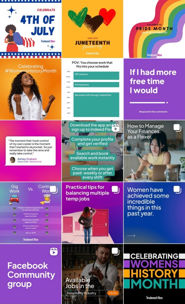Social media management for Indeed Flex from 2021 to 2024.